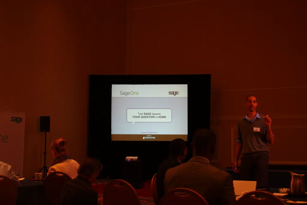 The goal of the SageOne EntrepreneursConnect session was to provide new and existing entrepreneurs of all sizes with a panel of different expertise from Social Media to money management and Investment advice. Michael Simmons led the discussions in a great Empact-style โmastermindsโ session. From the beginning of the session Michael set the stage and asked participants to text-in their questions for the panel. This was an excellent way of getting the audience to participate from the get go and include them in the discussion. The format works really well in sparking interesting discussions and answering questions. In order to keep the audience involved and interested different Mobile engagement types (such as Mobile Surveys, Text-In-Question, and Text-To-Screen) were leveraged throughout the session. Initially the audience was asked to vote few times via texting, while the results tabulated on the main stage screen in real time. Then the results were used to spark interesting โmastermindโ conversations.